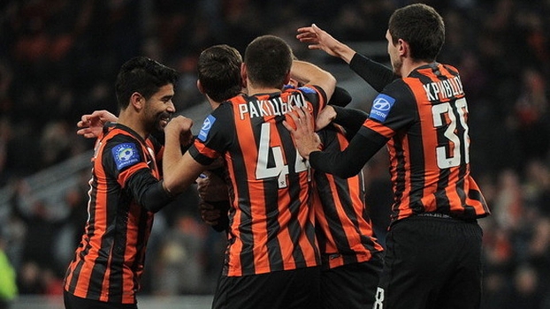 Jogadores do Shakhtar comemoram durante goleada sobre o Arsenal Kiev